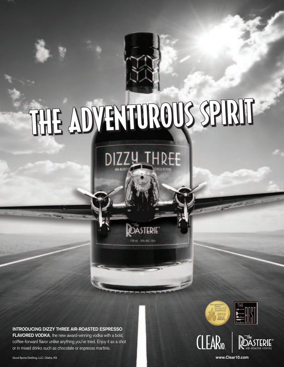 The DC-3 airliner on the label of this espresso-flavored vodka evokes a nostalgic sense of adventure, so the headline playing with the double meaning of “spirit” almost seems like a no-brainer. We paid it off by placing the bottle on a runway and showing the plane about to fly right off the label.