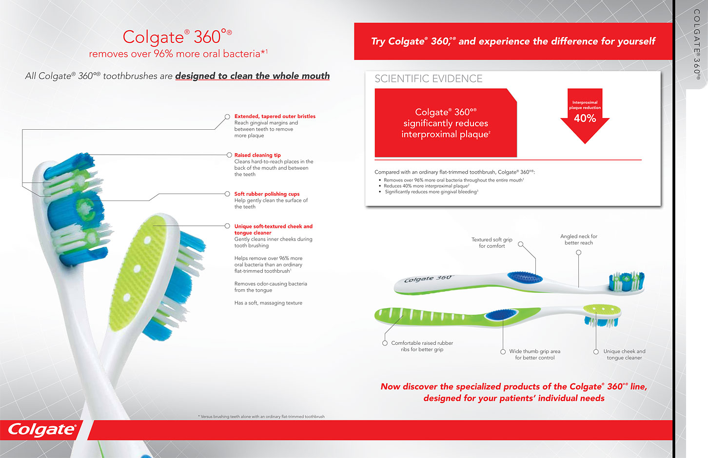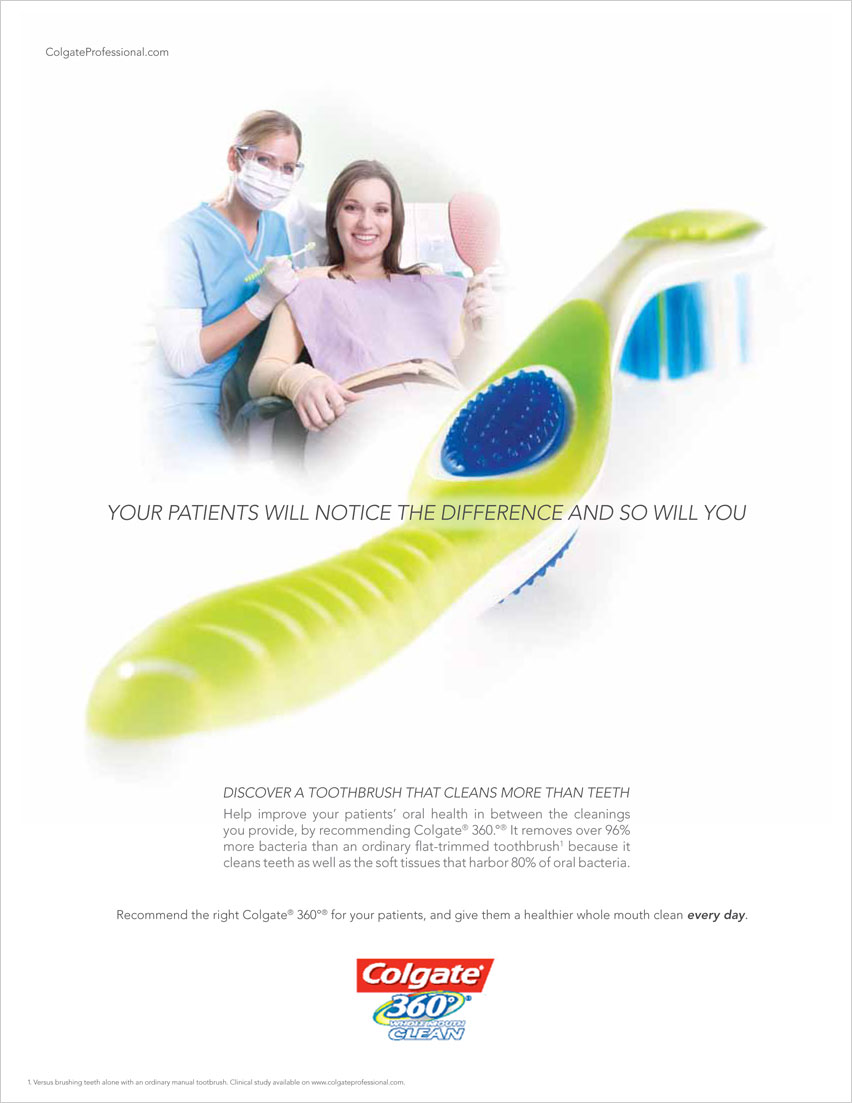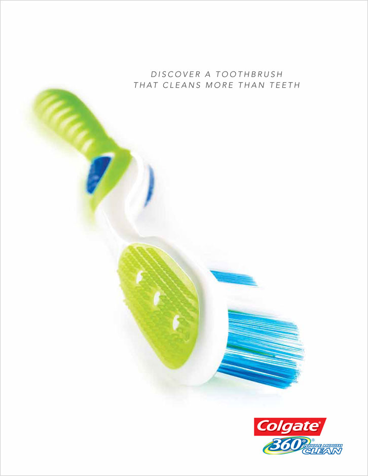 To launch the Colgate 360 toothbrush to the dentist and dental hygienist audience in a standout way, I suggested treating the product like a car. The photo’s dramatic angles and lighting highlight the contours of the distinctive-looking toothbrush, and the copy gives a subtle nod to the language of luxury car ads.